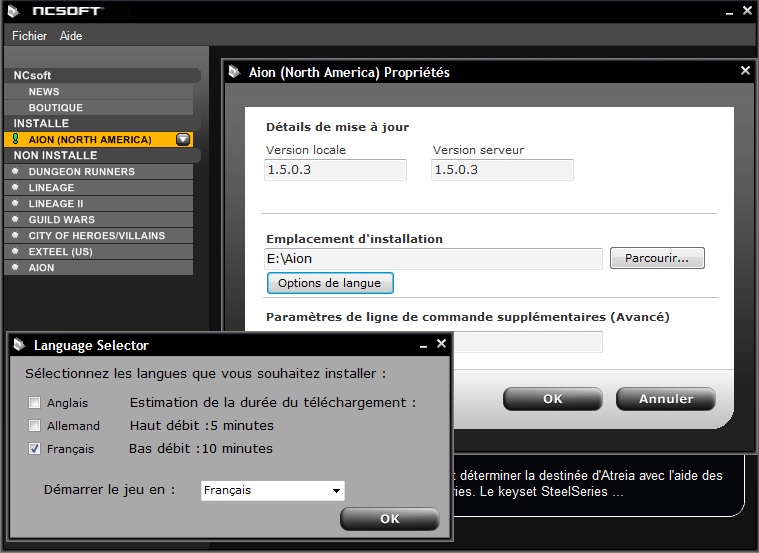 Dans le launcher NCsoft, faites un clic droit sur "aion" et cliquez sur "préférences". Ensuites vous avez une autre option pour choisir la langue. Je suis pas chez moi la, mais je vous ferrais un screen demain.